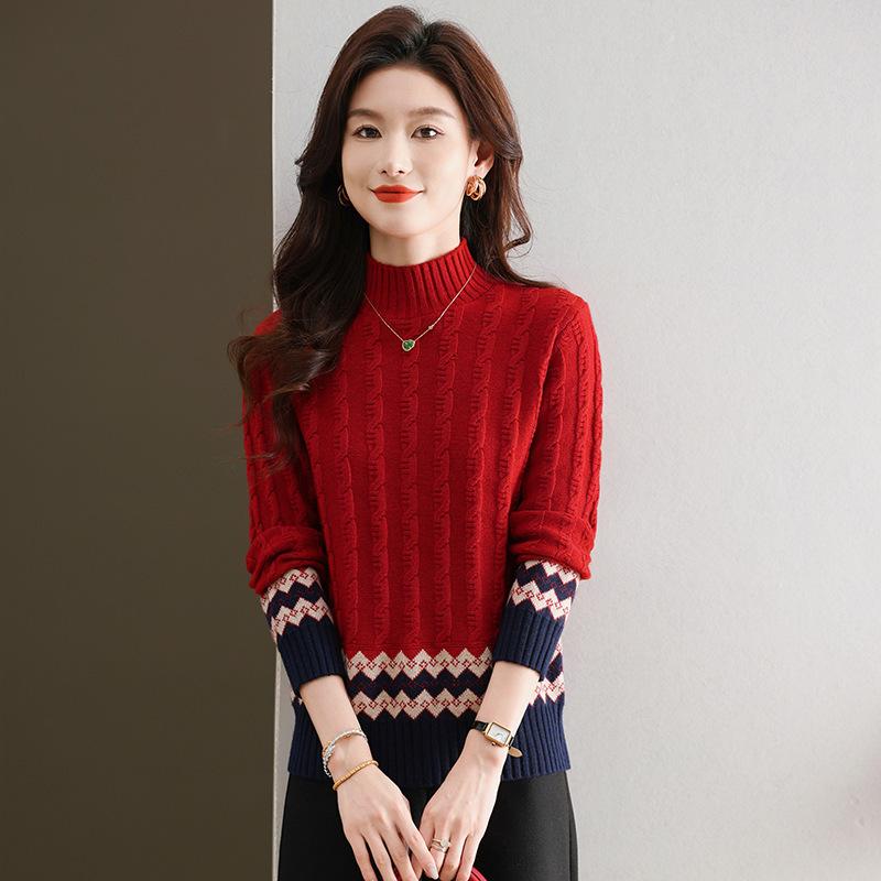 ニット レディース 高品質 上質 ハーフハイネック モックネック レトロ ヴィンテージ ジャカード ウール 羊毛 カシミヤ プルオーバー セーター 秋冬 インナー
