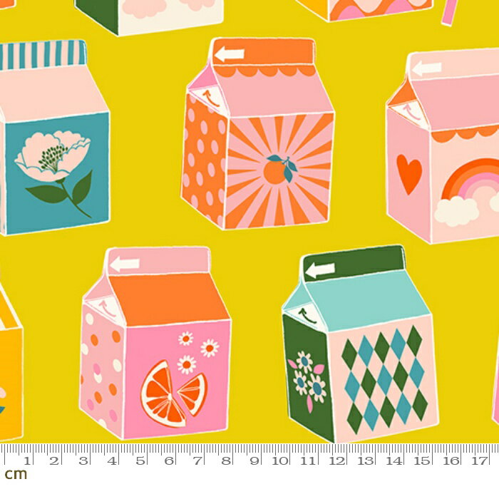 【Moda モダ】Juicy-RS0086-15(3B-08) イエロー カラフル 紙パック ジュース柄 フルーツ柄 レトロポップ ruby star ルビースター コットン100% シーチング【10cm単位販売】