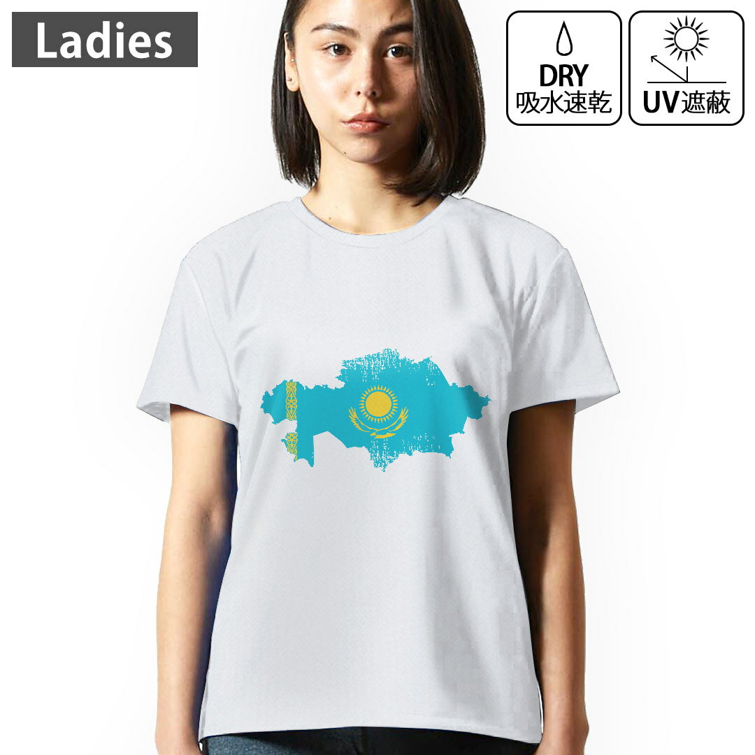レディース ドライTシャツ ホワイト 半袖 4.1オンス ジム トレーニング スポーツ 運動会 ドライアスレチック UVカット 紫外線遮蔽 吸水速乾 デザイン Tshirt M L 国旗 kazakhstan カザフスタン 018861