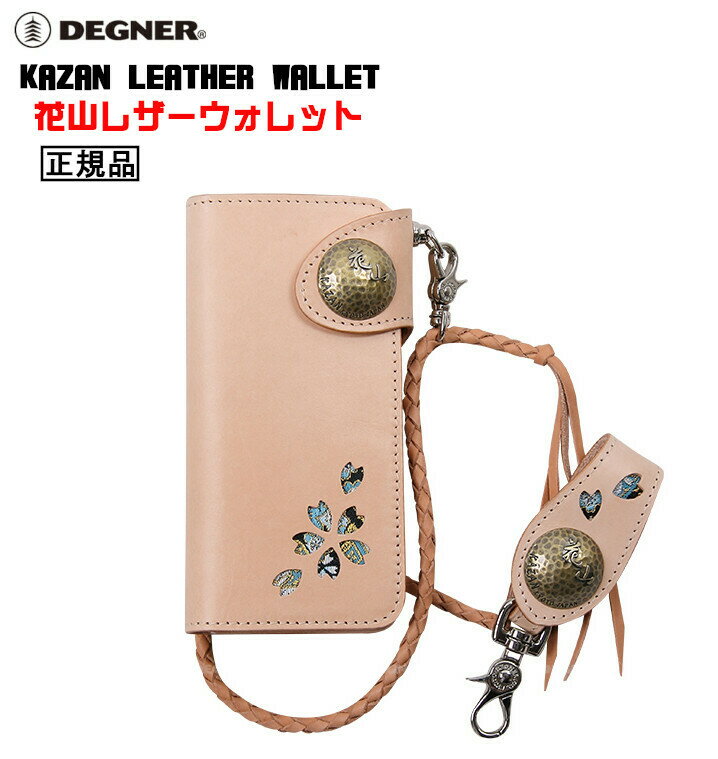 【送料無料!】正規品 [DEGNER KAZAN LEATHER WALLET /W-77K-都桜-TAN] デグナー 本革 花山レザーウォレット! タン スタイリッシュなレザー製品をメインにプロデュースする京都革工房【DEGNER】正規代理店! 【特別価格! DEGNER KAZAN LEATHER WALLET /W-77K-都桜-TAN】 本革製のウォレットに、桜の切り抜きからチラッと覗く都桜の金襴織物がシンプルながら華やかで美しい印象を与えてくれる。「花山」ブランドの、「和」のテイストを前面に押し出した渋さと美しさの合わさる絶妙なデザインが人気。飾り過ぎないデザインで、普段のコーデからバイカーズコーデまで、どんなコーデにも合わせやすいのがポイント。デグナーの花山ブランドオリジナルのコンチョがワンポイントに。ウォレット本体はボタン開閉式で、バッグの中などでも中身が散らばってしまうのを防止。小銭入れ、お札入れ、カード入れと充実した収納力。オリジナルのウォレットロープ付きなので、ベルトループなどに取り付けることで落としてしまう心配がなくなります。【商品仕様】■型番:W-77K■素材:牛革(天然タンニンなめし)/金襴織物■サイズ:縦19.3×横9.5×幅2.5(cm)■付属品:ウォレットロープ【柄/カラー】都桜/タン※商品の仕様やデザインはメーカー都合により予告なく変更になる場合がございます。 メーカーに「在庫がある商品」では通常、お届けまでに「1〜2週間前後」のお時間を頂いております。メーカーに「在庫がない商品」に関しましては、お届けまでに「1ヶ月以上」、またはタイミングにより「売り切れ」や「生産終了」となっている場合がございますので、何卒ご理解下さいますようお願い致します。また、商品によっては説明不足な点や、システムのタイムラグによって納期や入荷状況が表示内容とは異なっている場合がございますので、お届けまでのお時間や商品についてのご不明な点などがございましたら、どうぞお気軽にお問い合わせ下さい!商品画像はできる限り現品を再現するように心がけておりますが、ご利用のモニターにより差異が生じますので予めご了承下さい。 1