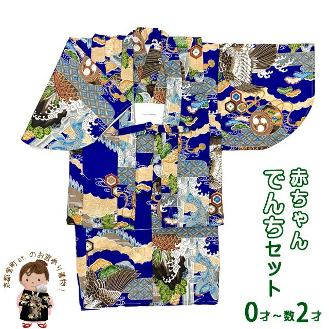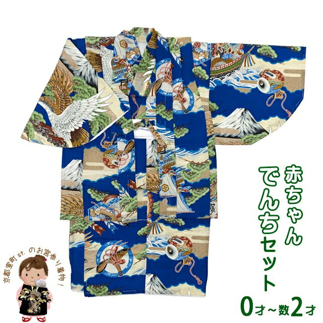 でんちセット 日本製 赤ちゃんの着物 初節句やお正月に 男の子 ちゃんちゃんこセット 化繊「水色系、鷹」KBDS020