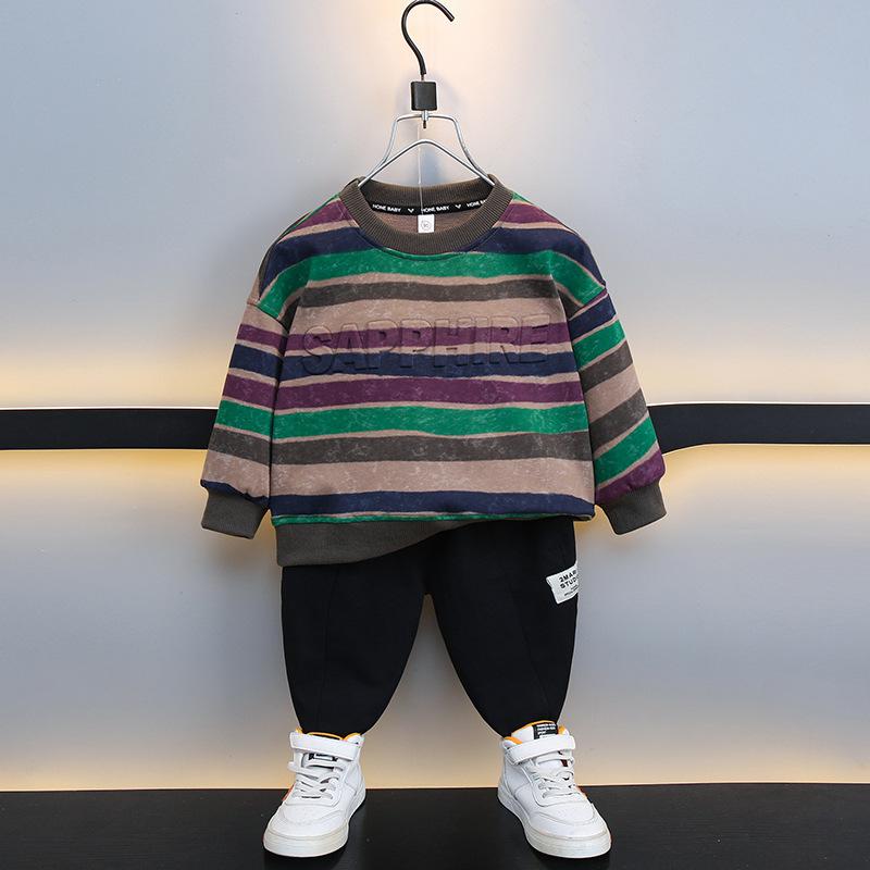 スウェット 男の子 キッズ クルーネック ストライプ エンボス加工 長袖 プルオーバー 春秋 カジュアル 普段使い 綿 コットン ブラウン パープル トップス