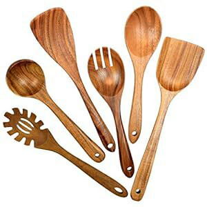 XDOWMO Wooden Utensils for Cooking, 6 Pack Organic Teak Wooden Spoons for Cooking Wood Utensil Set and Spatula for Kitchen