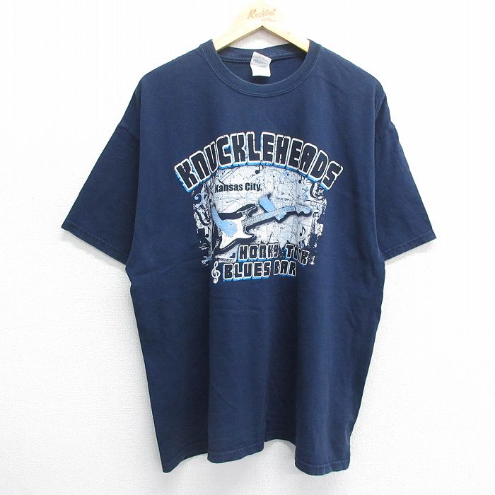 【中古】古着 半袖 ビンテージ ヴィンテージTシャツ メンズ 00年代 00s KNUCKLEHEADS ギター ロング丈 大きいサイズ 2L LL ビッグシルエット ゆったり ビッグサイズ オーバーサイズ コットン クルーネック 丸首 紺 ネイビー XLサイズ 中古 | 春夏 夏物 夏服 5OF