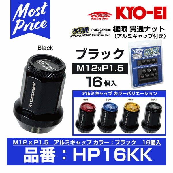 KYO-EI 協永産業 極限 貫通ナット アルミキャップ付き 16個入 M12x1.5 ブラック 【HP16KK】 | キョーエイ KYOEI KICS キックス KYOKUGEN 軽量ナット BLACK 盗難防止 7角形ナット 12×1.5 トヨタ ホンダ マツダ ミツビシ ダイハツ車に おすすめ