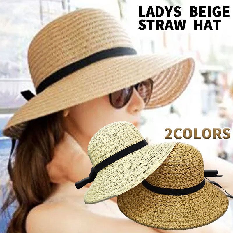 レディース 麦わら帽子 リボン付きストローハット 春夏新作/日焼け止め/草編み帽子/2color/透け感 STRAW HAT/ハット beige/ベージュ 帽子 日よけ 麦わら帽子[返品、交換及びキャンセル不可]