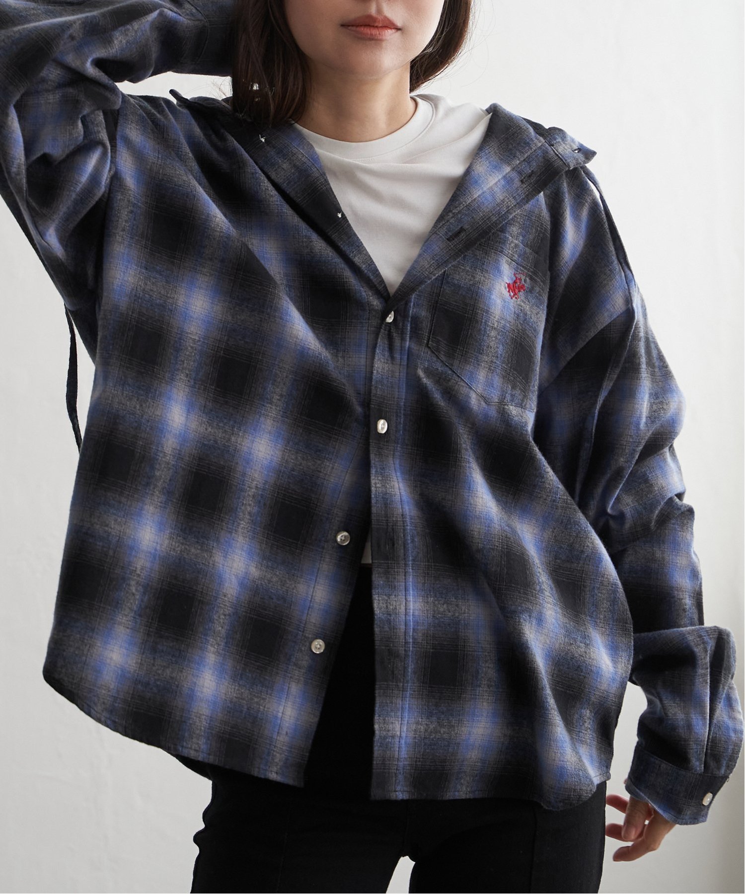 VENCE share style Ladys BEVERLY HILLS POLO CLUB ネルチェックシャツパーカー ヴァンス エクスチェンジ トップス シャツ・ブラウス ブルー グレー【送料無料】
