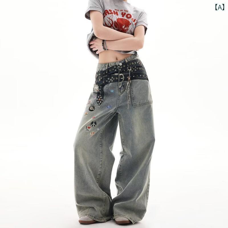 デニムパンツ ユニセックス アメカジ ストリート ルーズフィット ワイドストレート ロング丈 ベルト ワッペン プリント ウォッシュ加工 ヴィンテージ加工 コットン ジーンズ ブルー ブラック カジュアル