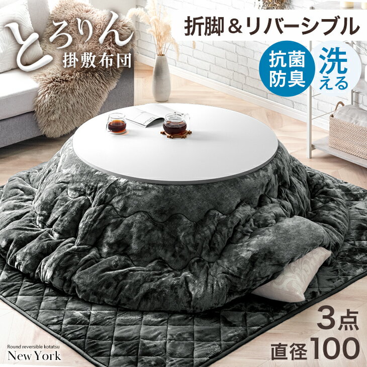 【4日19時半~LIVEエントリ-P5倍】 リバーシブル こたつ とろりん 布団 3点セット 折れ脚 円形 直径100 こたつテーブル 掛敷布団 丸型 コタツ テーブル 円卓 こたつセット 掛け布団 敷き布団 こたつ掛敷 掛敷セット こたつ布団 シンプル ブラック ホワイト