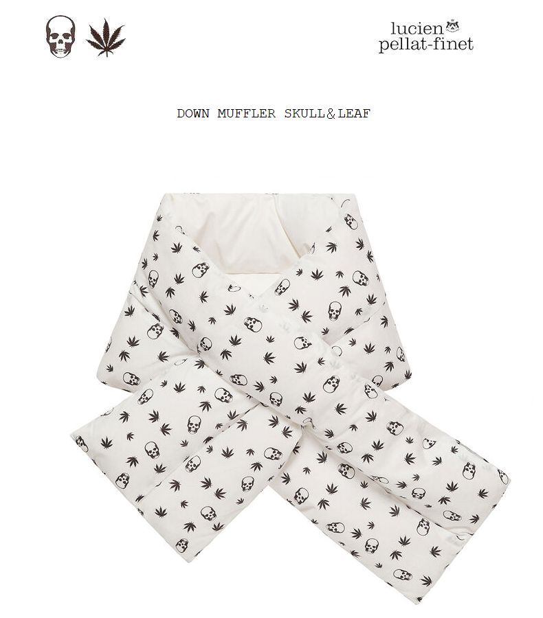 Lucien Pellat-Finet ルシアン・ペラフィネ「The King of Cashmere」 キング・オブ・カシミヤ フランス人デザイナー”ルシアン・ペラフィネカシミヤのフィルターを通してデザイナーの“陽気な気持ち”をクリエイトコレクションを通して,今の気分や思い“生きる喜び”を伝えています。スカル,リーフ,ピースをアイコンに取り入れたラグジュアリーストリートウェア。………………………………………………………………………………… DOWN SCARF ダウンスカーフ. 秋冬モデル.防寒期にピッタリな暖かいダウン入りマフラー。上質なダウンを使用した軽くて柔らかな質感のマフラーが登場。たっぷりとダウンを封入したボリューム感が魅力。片側に設けられたスリットに通して固定させるデザイン。ルシアンぺラフィネとしてはお求めやすい価格も魅力です。アイコンのスカル&リーフのモノグラムを取り入れたリュクスなデザイン。表面(モノグラム柄)はコットン、裏面にはポリエステル素材。日本製.………………………………………………………………………………… ■素材…コットン100% ポリエステル100% 中綿…ダウン90% フェザー10%■size…全長118センチ 幅20センチ。いずれも約。 男女兼用(ユニセックス)フリーサイズモデル。…………………………………………………………………………………当店はLucien pellat-finet国内正規取り扱い店です