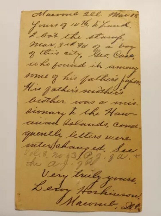 1894年 HIRAM E DEATS 郵便カード 件名: マコーム IL ハワイ宣教師 切手カバー