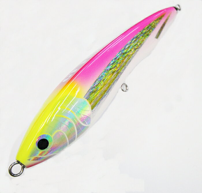 ・サイズ:全長約235mm ・最大高さ::約43mm ・最大幅:約32mm ・重量:約125~135g ・推奨フック:トレブル5/0~6/0(負荷重量26~35g) ・素材:ウッド、ステンレス貫通構造 MAIKOは複雑なボディ形状すべてに意味があり、低中速での泳ぐ、潜る、止まる、平打ちすべてを高次元でこなします。その反面高速な動きは苦手です。 大型のGT、ヒラマサ、マグロをターゲットとしており、モルジブ、オマーン、インドネシア、吐噶喇をはじめとした日本全国で高い実績を上げています。 ルアーアクションは、ロングキャストからの2〜3回のジャークでアピールした後に、リー リングしながらのショートトゥイッチで、水面下をゆらゆらとアピールし、大型の捕食者 を誘発します。 GT、ヒラマサのすれた大物がバイトするMAIKOアクションをお楽しみください。