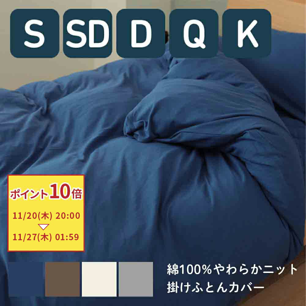 お肌になじむやわらかコットンニット 綿100%掛けふとんカバー コットン100%、やわらか天竺ニット素材は私たちの生活に慣れ親しんだTシャツのようなやわらかタッチ。お肌になじみやすく、季節を選ばずオールシーズン快適に使える寝具シリーズです。 オールシーズン快適に使えるやわらかコットンニット ●天然素材コットン100% ●やわらかタッチの天竺ニット ●オールシーズンムレにくく快適 ●日常に溶け込むカジュアルさ ●肌になじむ天然素材コットン100% 自然と馴染む心地よさ なめらかできめ細かい、天然素材のコットン100%生地を採用。寝ている間も自然な感覚でなじみやすく、お肌に優しい素材です。 吸湿性に優れ寝汗を吸収 コットン素材は吸湿性に優れているため、寝ている間の汗をしっかり吸収し、ムレにくく快適な環境を保ちます。 ●やわらかタッチの天竺ニット Tシャツのようななじみの素材 天竺編みは、一般的なTシャツに使われている凸凹のないなめらかな編み方。慣れ親しんだTシャツのようなやわらかタッチと、心地よい伸縮性が特長の生地です。 ●オールシーズンムレにくく快適な寝心地 一年中ムレにくくサラッと快適 吸湿性に優れたコットン素材はムレにくく、一年を通してサラッとしたさわり心地で、季節を選ばず快適にお使いいただけます。 使い込むほど心地よい 洗濯を重ねて使い込むほど、素材の柔らかさが増し、お肌にも馴染みやすくなります。長く心地よく使える1枚です。 日常に溶け込むカジュアルさ 日常生活に自然と溶け込む、シンプルな取り入れやすさを意識したカラー展開。季節を問わずお部屋を穏やかな雰囲気に演出する、カジュアル&ナチュラルな4色を採用しました。 スリット付き&ボタンホックでらくらくカバー交換 8か所のループ止めはボタンホックを使用。手の届きにくいファスナー面の対面には3か所のスリット付きで、カバーの付け外しがしやすく、カバー交換の負担を軽減してくれます。 サイズ シングル 150×210cm / セミダブル 170×210cm / ダブル 190×210cm / クイーン 210×210cm / キング 230×210cm カラー ネイビー / ブラウン / グレー / アイボリー 素材 綿 100% 特殊加工 8箇所ループ止め(ボタンホック式) / 片側3箇所スリット付き / 片側全開ファスナー ブランド ジュリーアダムス メーカー メルクロス株式会社 生産国 中国 洗濯情報 洗濯機可(ネット使用)