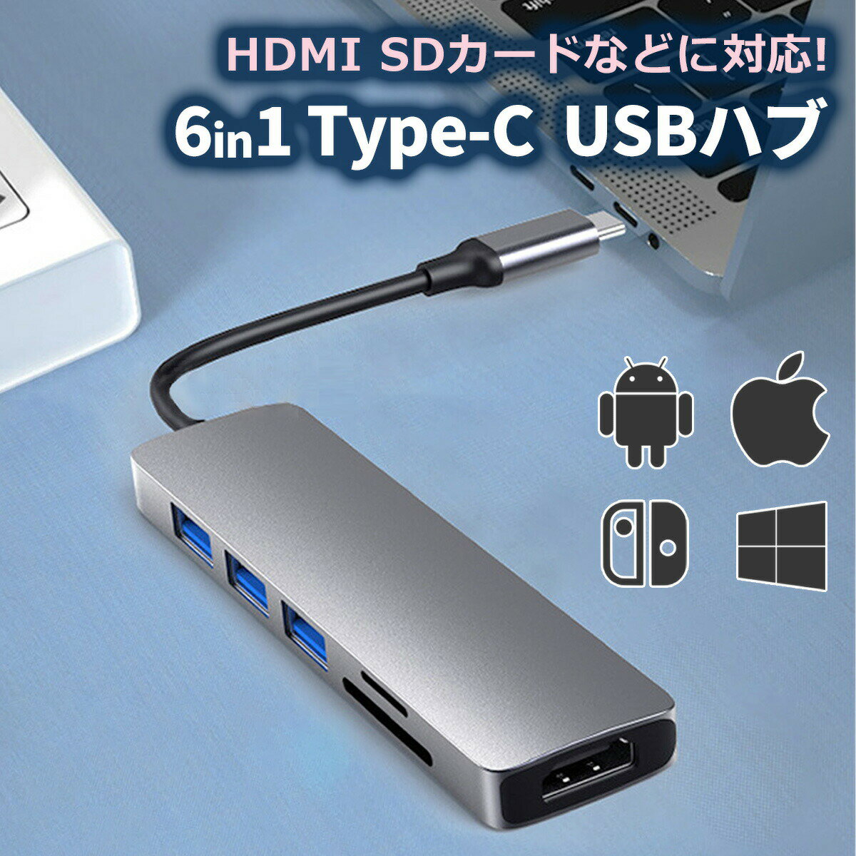 USB Type-C ハブ HDMI 4K USB3.0 SDカードリーダー microSDカードリーダー 6in1 薄型 軽量アルミ合金 USB変換アダプター PD対応 MacBook ノートパソコン ノートPC surface iPad Android タブレット