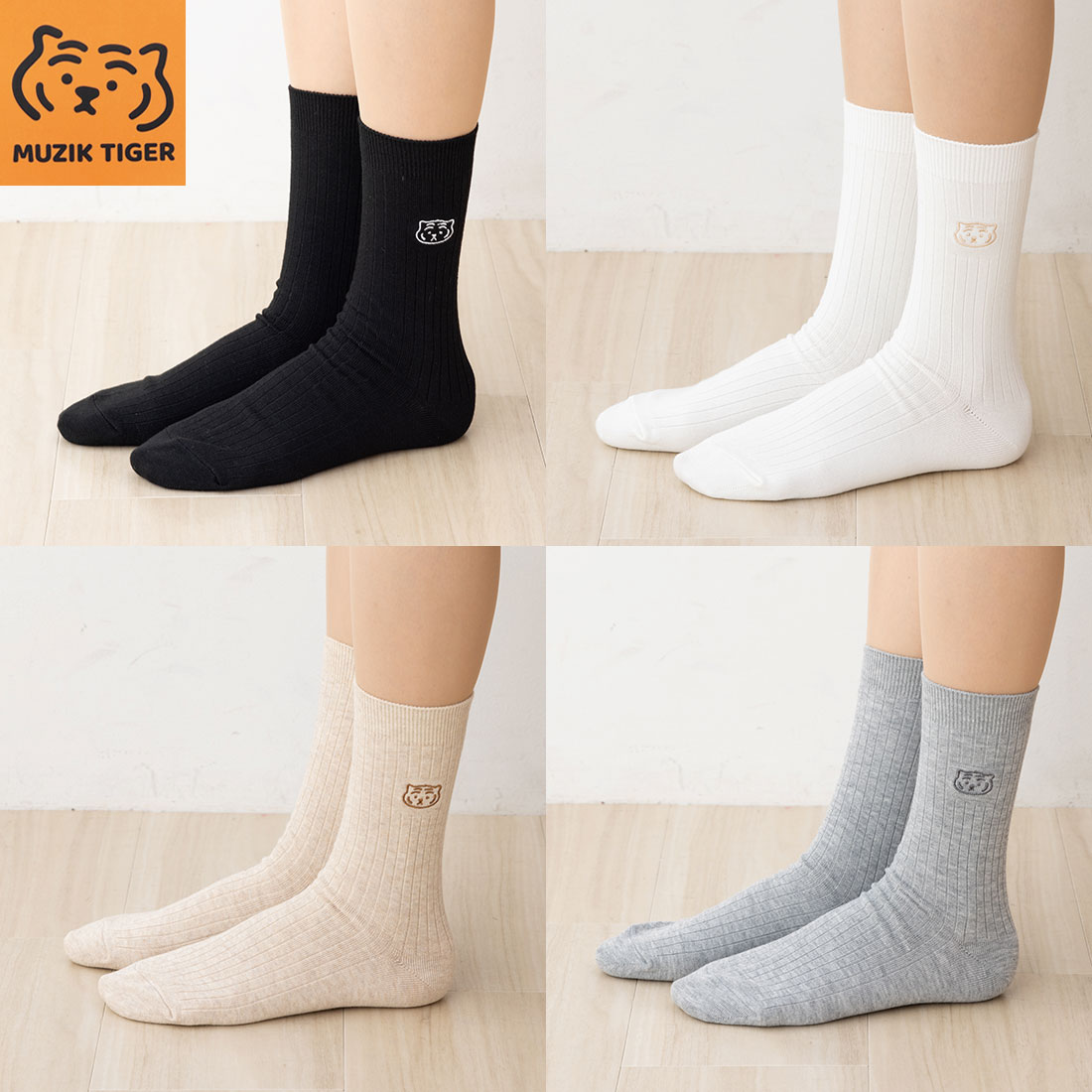 MUZIK TIGER ワンポイント刺繍 クルーソックス 23-25cm 白・黒・グレー・ベージュ レディース 靴下 ムジークタイガー 助野 sk-54p28820