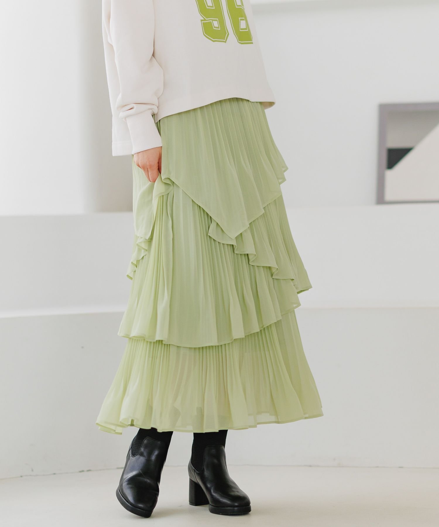 【SALE/50%OFF】mysty woman プリーツアシメティアードスカート ミスティウーマン スカート ロング・マキシスカート ブラック ホワイト グリーン【送料無料】