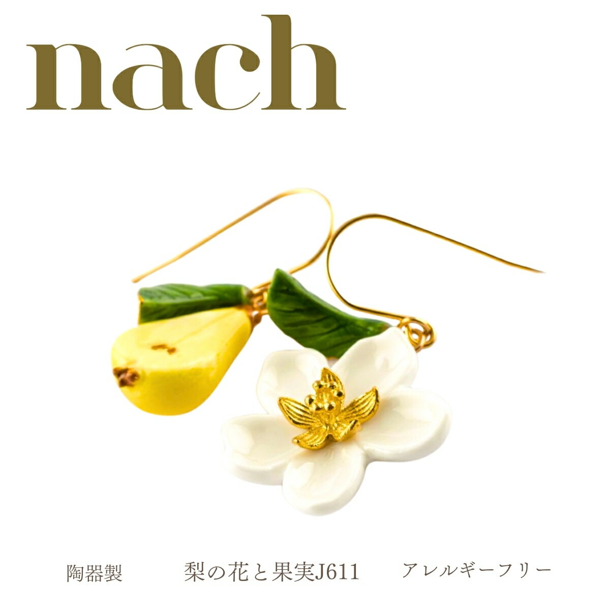 nach ナッシュ【梨の花と果実 j611】ピアス サイズフリー ミニチュア 24金メッキ 真鍮 陶器 アニマル ギフト プレゼント かわいい おしゃれ 女性 彼女 プレゼント 誕生日 クリスマス 磁器 金 果物 フルーツ フラワー