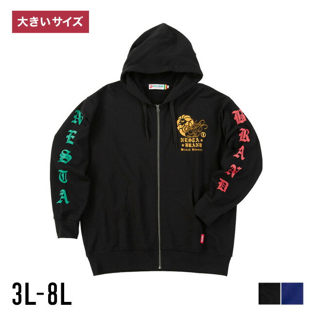 大きいサイズ メンズ パーカー 裏毛 3L 4L 5L 6L 8L 秋 冬 春 秋服 冬服 春服 ブラック 黒 長袖 ビッグサイズ ヘビーウェイト NESTA BRAND フード サイドポケット プリント リブ フルジップ ネスタブランド