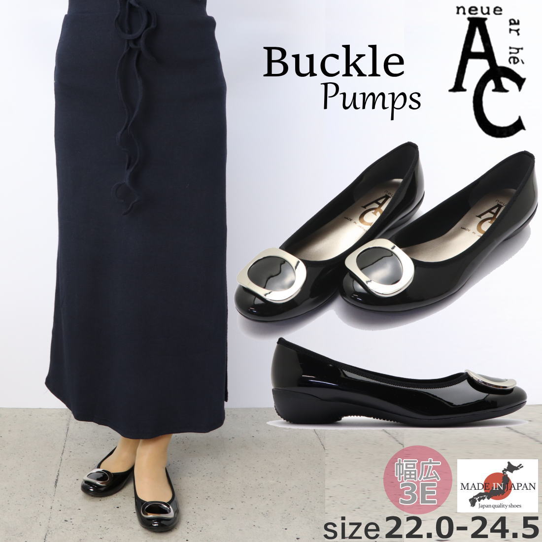 日本製 パンプス AC neue ar he 幅広 3E バックル エナメル ローヒール ラウンド 入学 入園 参観日 シェル No.1580