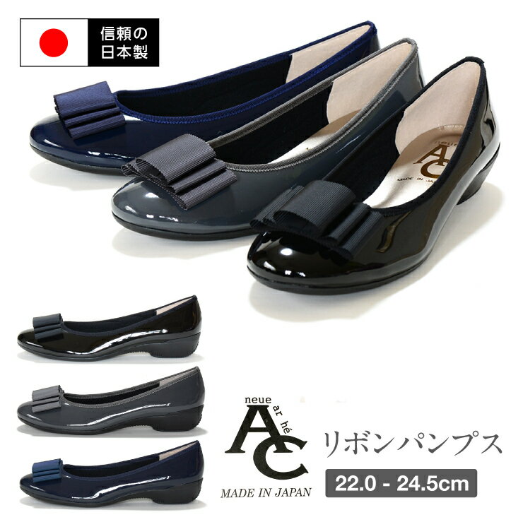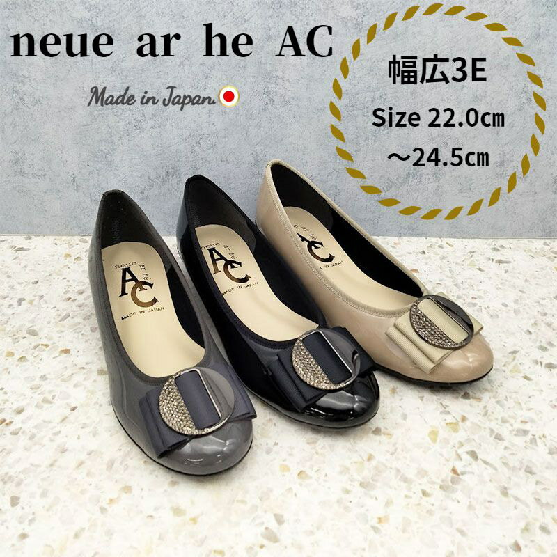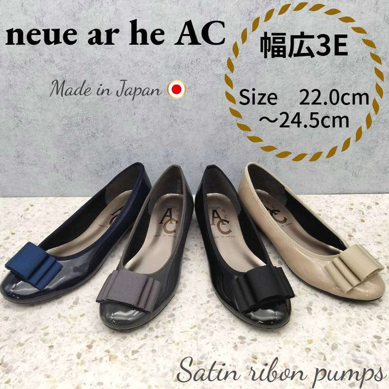 【送料無料】【日本製】neue ar he AC リボンパンプス 日本製 3E エナメル サテンリボン ローヒール バレエシューズ 美脚 雨の日 幅広 キレイ系 エレガント オフィス 通勤 冠婚葬祭 ぺたんこ外反母趾 mh-1527 [lowheel]