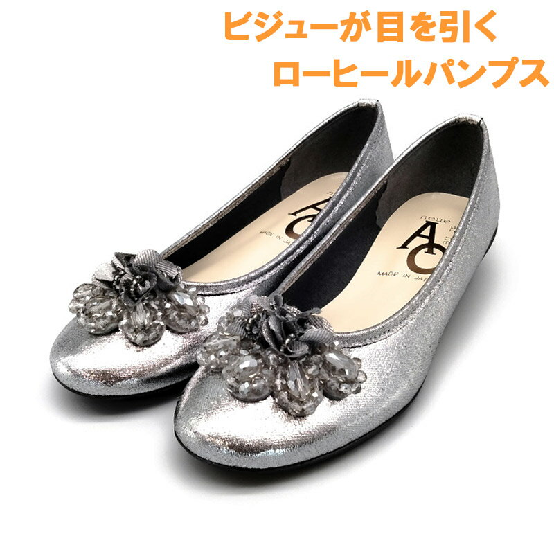 3E ロンサム レディース neue ar he AC パンプス 靴 シューズ 通勤 お出かけ おしゃれ 卒園 卒業 セレモニー 日本製 国産 ローヒール ビジュー 痛くない シルバー 送料無料 1312