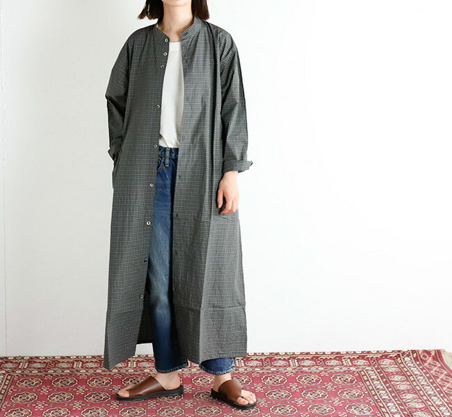 ・メーカー希望小売価格はメーカー商品タグに基づいて掲載していますBRAND : nisica ニシカ ----------------------------------------------------------------------- NAME:バンドカラーOP NIS-1110 ----------------------------------------------------------------------- nisica ニシカより バンドカラーワンピースが入荷しました。 長袖なので長いシーズン着て頂けます。 ワンピースとして着たり、前を開けて着たり、 ボトムにパンツを組み合わせたりコーディネートの幅が広がる1枚です。 深めのポケットなのでスマホなどを入れても落としにくく 薄くてハリのある生地なので体のラインをひろいにくいです。 nisica ニシカ 人と服とが適度な距離を保ちながらバランスが取れている。そういうものこそ着る人と中身と個性があらわれる服となり、そこに服の本質があると。 毎日の生活に必要な日常着、だらしなく見えない趣味の良い服、普段ファッションの話などしない人の為の服、ニシカのデザイナーたちは、空の箱を渡すだけというぐらいの感覚。つくりたいのは、形でなく雰囲気であると。 ■素材: コットン100% ■カラー:グレーチェック ■サイズ S:肩幅 48cm 袖丈54cm 身幅 56cm 着丈118cm 裾幅 71cm 153cm 着用