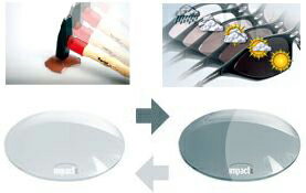 【レンズ特徴】 ■調光レンズは可視光線及び紫外線の量によって可視光線透過率でクリアからダークカラーに変色します。 快晴から夜間まで使用可能です ■最新レンズとなり車内や真夏の高温時にも影響されず変色します。 ■さらにアクシデントによる衝撃にも堅牢でほとんど破損することは有りません。 ■眼に有害な紫外線は100%カットされます。 インパクトX2調光レーザーレッド 可視光線透過率は73%〜16% ■トップアスリートのために開発されたレンズで、高度な光学性能を保ちながら、有害なブルーライトを抑制しコントラストを高める働きがあります。その効果で、眼からくる疲れを大幅に緩和出来ます。 さらに遠近感や視界の明瞭さも強調させるので、自転車・テニス・ランニングなど様々なスポーツに向いています。 インパクトX2調光レーザーブラック 可視光線透過率は62%〜13% ■ブラックカラーは可視光線全てを万遍無く抑え眩しさを和らげ自然な見え方と成ります。 インパクトX2調光レーザーブラウン 可視光線透過率は73%〜17% ■ブラウンカラーは眩しさを抑えながら明るい見え方でブルーライトカット効果が有り疲れを抑制します。