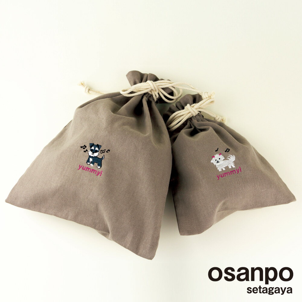 【わんこ刺しゅう+メッセージ osanpo setagayaエンブロイダリー(刺繍)巾着 Mサイズ】【名入れ:わんちゃんの刺しゅう+メッセージをオリジナルで刺しゅう】上履き袋 犬 オリジナル刺しゅう わんこ 犬 DOG 巾着 ポーチ 犬刺しゅう 名入れサービス おさんぽ