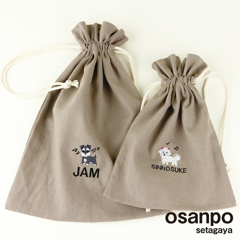【わんこ刺しゅう+わんこの名前 osanpo setagayaエンブロイダリー(刺繍)巾着 Mサイズ】【名入れ:わんちゃんの刺しゅう+わんこの名前を刺しゅう】上履き袋 犬 オリジナル刺しゅう 名前 犬名前 わんこ名前 わんこ 犬 DOG 巾着 ポーチ 犬刺しゅう 名入れサービス おさんぽ