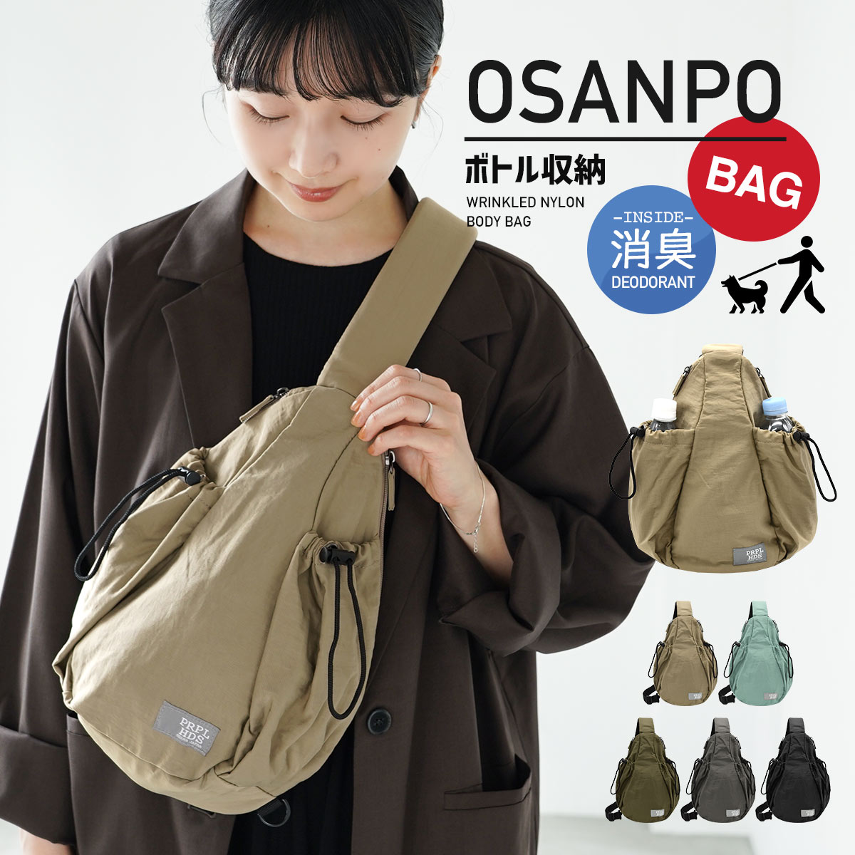 【まとめ割最大15%OFF】 【OSANPO】お散歩バッグ ボディバッグ 斜めがけ レディース メンズ 肩掛け ユニセックス ペットボトル2本収納 消臭ネーム しわ加工ナイロン A5対応 左右直結ファスナー 背面メッシュ 軽量 犬の散歩 マザーズ 旅行