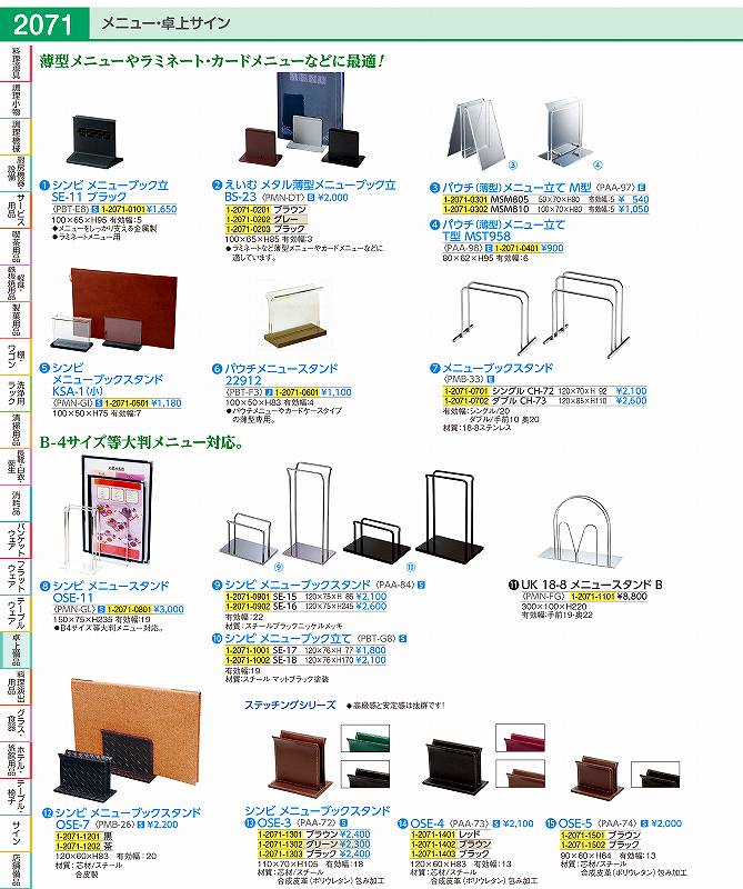 シンビ メニューブック立 SE-10N ブラック PBTE701 JANコード 4995446571893●メーカー品番:SE-10N●カラー:ブラック●幅×奥行×高さ(mm):110×68×103●有効幅(mm):20●材質:スチールメッキ■メニューをしっかり支える金属製【送料について】北海道、沖縄、離島は送料を頂きます。