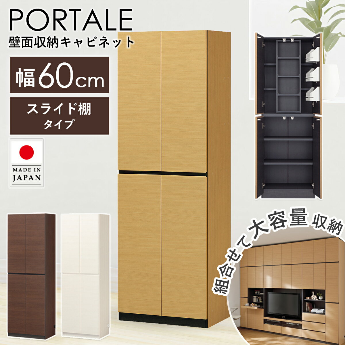 -商品情報 - 天井までたっぷり使える、大容量壁面収納キャビネット・ポルターレ。扉付きなので収納した物が見えず、お部屋がすっきりとした印象になります。収納庫タイプや引き出しタイプ、テレビ台として使えるタイプなど、バリエーションも豊富。突っ張り式の上置きをセットすれば、収納力もアップしつつ耐震性もばっちりです。どんなリビングにも馴染みやすい、取っ手の無いすっきりシンプルなデザインに、北欧テイストの木目柄を3色ラインナップしました。 -サイズ- 本体:幅60×奥行41.6×高さ180cm -材質- 本体:プリント紙化粧繊維板 -仕様- 色:ナチュラル、ダークブラウン、ホワイトウッド 移動棚:4枚 耐荷重:棚板10kg 耐震ラッチ付き 扉ダンパー付き 棚ストッパー付き 幅木よけ加工済み 配線キャップ付き 免震補助バンド付き ・別売の上置き(幅60cm)をセットできます ・上置きをセットした場合の有効天井高:235〜245cm お客様組立品[組立の目安:90分程度] ※安全のため、組立設置は2人以上で行ってください。 -お支払方法について- 代金引換はご利用いただけません -配送- 玄関先お届け -お届けの目安- 3営業日後出荷/4-5日後お届け ※土日祝日は定休日 -配達日時指定- 指定可 -追加送料が必要な地域- 沖縄県全域/離島(金額は事前にお問い合わせください)■ Item lineup ※画像をクリックすると各商品購入ページへ移動します