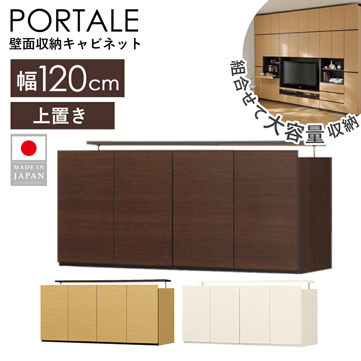 -商品情報 - 天井までたっぷり使える、大容量壁面収納キャビネット・ポルターレ。扉付きなので収納した物が見えず、お部屋がすっきりとした印象になります。収納庫タイプや引き出しタイプ、テレビ台として使えるタイプなど、バリエーションも豊富。突っ張り式の上置きをセットすれば、収納力もアップしつつ耐震性もばっちりです。どんなリビングにも馴染みやすい、取っ手の無いすっきりシンプルなデザインに、北欧テイストの木目柄を3色ラインナップしました。 -サイズ- 本体:幅120×奥行41.6×高さ180cm -材質- 本体:プリント紙化粧繊維板 引出前板:スモークガラス(4mm厚) -仕様- 色:ナチュラル、ダークブラウン、ホワイトウッド 移動棚:2枚 耐荷重:棚板10kg、テレビ用中棚50kg テレビ対応サイズ:32型、37型、40型、42型 耐震ラッチ付き 扉ダンパー付き 棚ストッパー付き 幅木よけ加工済み 配線キャップ付き 免震補助バンド付き ・32インチ〜42インチ程度のテレビが設置できます(お手持ちのテレビサイズをご確認下さい) ・下段は奥までしっかり引き出せる、フルスライドレール引き出しです ・スライド棚板を引き出して簡易デスクになります ・別売の上置き(幅120cm)をセットできます ・上置きをセットした場合の有効天井高:235〜245cm お客様組立品[組立の目安:120分程度] ※安全のため、組立設置は2人以上で行ってください。 -お支払方法について- 代金引換はご利用いただけません -配送- 玄関先お届け -お届けの目安- 3営業日後出荷/4-5日後お届け ※土日祝日は定休日 -配達日時指定- 指定可 -追加送料が必要な地域- 沖縄県全域/離島(金額は事前にお問い合わせください)■ Item lineup ※画像をクリックすると各商品購入ページへ移動します