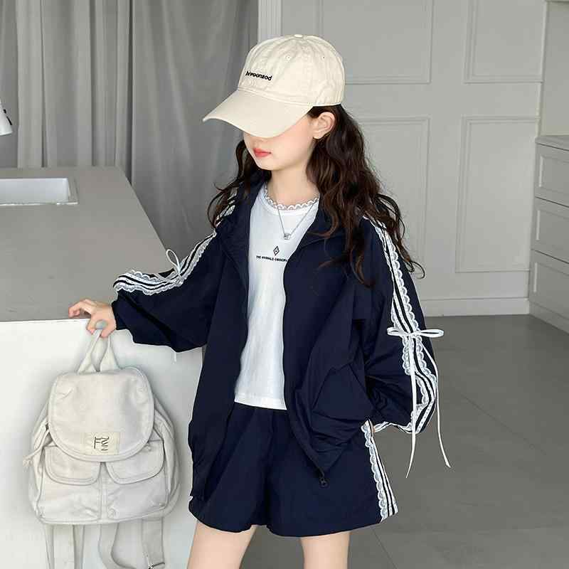 キッズ 女の子 パンツセットアップ 2点セット 薄手 半袖 花柄レース 蝶結び ショートパンツ 接触冷感 紫外線対策 普段着 部屋着 春夏・対象: 女の子・スタイル: 韓国風・セット内容: パンツ、トップス・セット枚数: 2枚・対象年齢: 中・高学年 (8歳以上、身長140cm以上)・袖丈: 半袖・パンツ丈: ショートパンツ・生地加工: 柔らか加工・厚さ: 薄手・柄: 無地・素材: 化学繊維・主素材: ポリエステル・主素材含有量: 100%・安全レベル: B類・留め具: ジッパー・カラー: 紺色、紫・対応身長: 120cm、130cm、140cm、150cm、160cm、170cm・要素: セットアップ、レース、蝶結び
