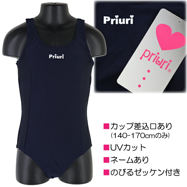 Priuri プリウリ スクール水着 ワンピース 水着 子供 キッズ 女児 のびるゼッケン付き 紺無地 120-170cm 入園 入学 通園 通学 水泳 【送料無料】