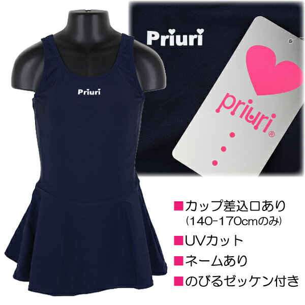 Priuri プリウリ スクール水着 Aライン ワンピース 水着 子供 キッズ 女児 のびるゼッケン付き 紺無地 120-170cm 入園 入学 通園 通学 水泳 【送料無料】