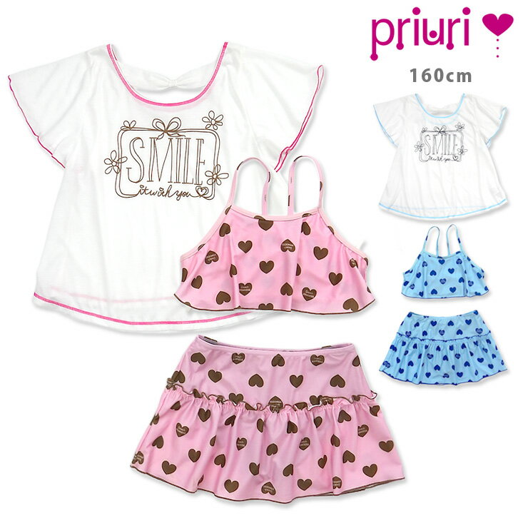 【エントリーでポイント10倍 11/20 20時〜】Priuri ジュニア 女の子 トップス付き セパレート 水着 3点セット 160cm プリウリ 378452 Tシャツ カットソー カバーアップ ミニスカート ハート柄 フリル 女児 サックス ピンク