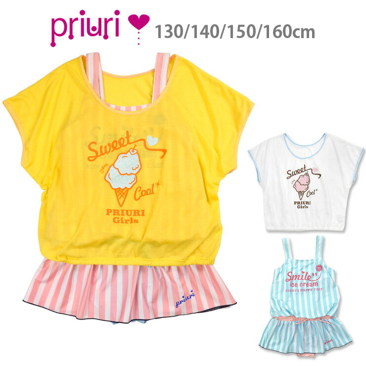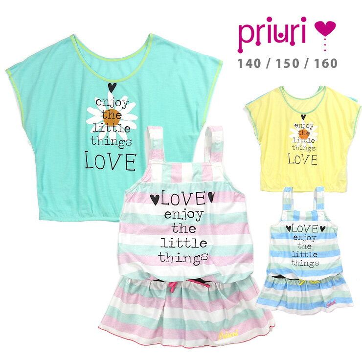 【エントリーでポイント10倍 11/20 20時〜】Priuri キッズ ジュニア 女の子 トップス付き ワンピース 水着 2点セット 140 150 160 プリウリ 368451 Tシャツ カットソー カバーアップ ミニスカート ボーダー 花 フラワー 女児 グリーン イエロー サックス ピンク