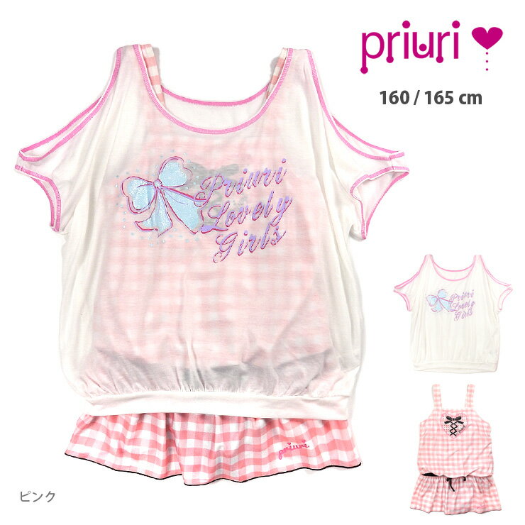 【エントリーでポイント10倍 11/20 20時〜】Priuri ジュニア 女の子用 トップス付き ワンピース 水着 2点セット 160 165 プリウリ 369401 セットアップ Tシャツ カットソー カバーアップ ミニスカート チェック リボン オープンショルダー 肩出し 女児 白 ホワイト ピンク
