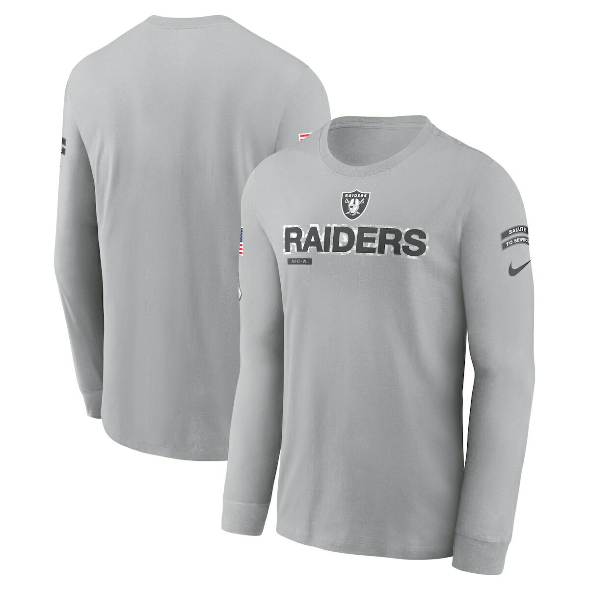 Honor our service members while supporting the Las Vegas Raiders with this 2024 Salute To Service Long Sleeve T-Shirt. This Nike gear features a military-inspired color scheme with an American Flag and the Salute to Service ribbon displayed on the right sleeve. Complete with striking Las Vegas Raiders graphics, this tee will have you ready for gameday. The NFL does not profit from the sale of Salute to Service products. Charitable contributions are awarded by the NFL Foundation to the NFL's charitable partners. For more information, please visit www.NFL.com/Salute.Officially licensedMaterial: 100% CottonU.S. flag patch on right sleeve: To reflect military uniforms and tradition, the flag is positioned so that the stars face the front and the stripes are behind. This gives the effect of the flag flying in the breeze as the wearer moves forward.Long sleeveBrand: NikeImportedCrew neckScreen print graphics