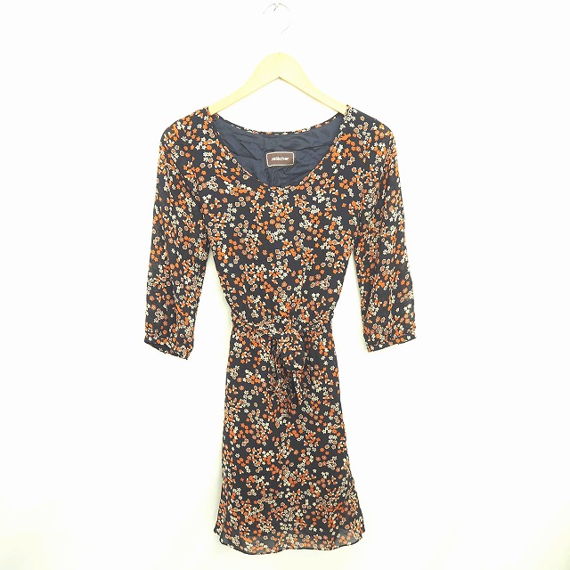【中古】ルラシェ Relacher ワンピース 膝下丈 プルオーバー 花柄 薄手 ウエストリボン 七分袖 F ブラック オレンジ 黒 /TT15 レディース 【ベクトル 古着】 210217 ブランド古着ベクトルプレミアム店