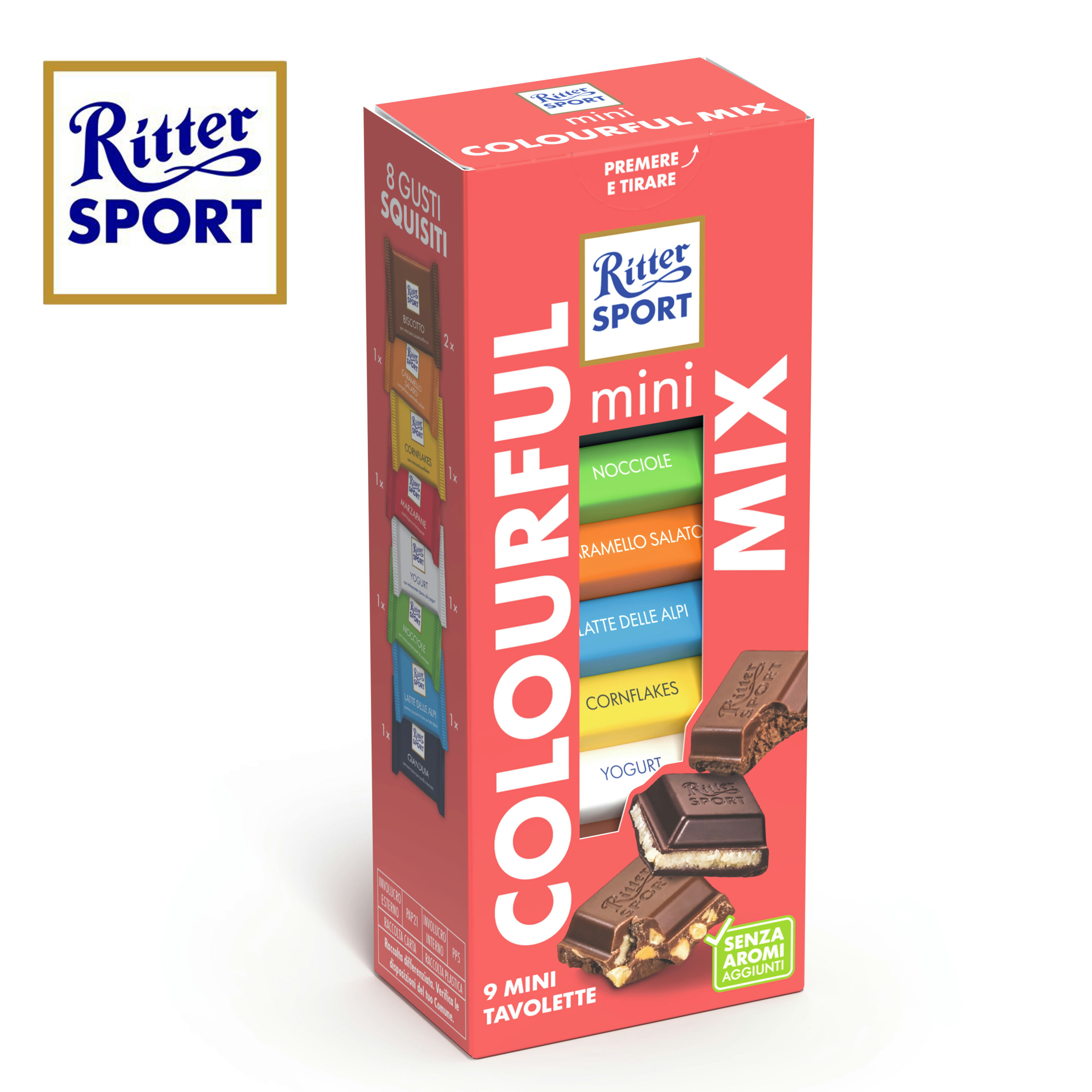 商品名RitterSportリッターカラフルバラエティ内容量133g原材料砂糖、カカオマス、ココアバター、全粉乳、乳糖、脱脂粉乳、ヘーゼルナッツペースト、乳脂肪、植物油脂、アーモンド、小麦粉、ヘーゼルナッツ、コーンフレーク、転化糖シロップ、バター、小麦でん粉、食塩、ぶどう糖果糖液糖、大麦麦芽エキス、ホエイパウダー/膨張剤、酵素、(一部に乳成分・小麦・アーモンド・大麦を含む)栄養成分(100gあたり)カロリー 533kcal原産国ドイツ賞味期限2026年8月保存方法直射日光、高温多湿を避け涼しい場所で保存お届け温度常温便商品説明可愛いミニサイズのチョコレートの詰め合わせ。6種類8枚入り。 ドイツ生まれのプレミアムチョコレートブランド! リッター・スポーツは、1912年にドイツで誕生したプレミアムチョコレートブランドです。 持ち運びやすさと割れにくさを追求した特徴的な正方形の形状が、このブランドの象徴。高品質な原材料を使用し、カカオ豆は持続可能な農法で栽培しており、環境保護への取り組みも評価されています。 幅広い世代に支持されるリッチな味わいが魅力で、目を引くスタイリッシュなパッケージや季節限定品、ギフトセットなど、用途に応じた商品展開も豊富。「手頃な価格で楽しめる上質なチョコレート」として世界中で愛されています。