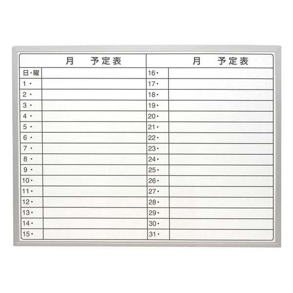 アルミフレームスケジュールボード 600×450 月間スケジュール罫線入りタイプです。 右と左に分けて、15日ごとのスケジュール変更と管理ができます。 本体寸法 W600×H450×D20mm 有効盤面寸法 W560×H410mm 本体重量 1.7kg 材質 フレーム・ペントレー/アルミ 盤面/スチール 芯材/段ボール 付属品 マーカー(黒・赤各1本)、イレーザー(1個)、マグネット(レッド4個) シリーズ ・600×450 ・900×600