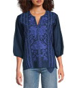 ジョニーワズ レディース トップス シャツ Vネック ブラウス リネン JOHNNY WAS Camille Embriordered Linen Split V-Neck 3/4 Puff Sleeve Blouse Navy ネイビー