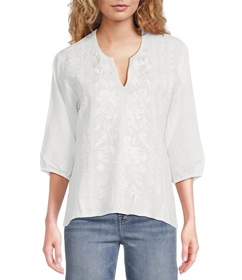 ジョニーワズ レディース トップス シャツ Vネック ブラウス リネン JOHNNY WAS Camille Embriordered Linen Split V-Neck 3/4 Puff Sleeve Blouse White ホワイト