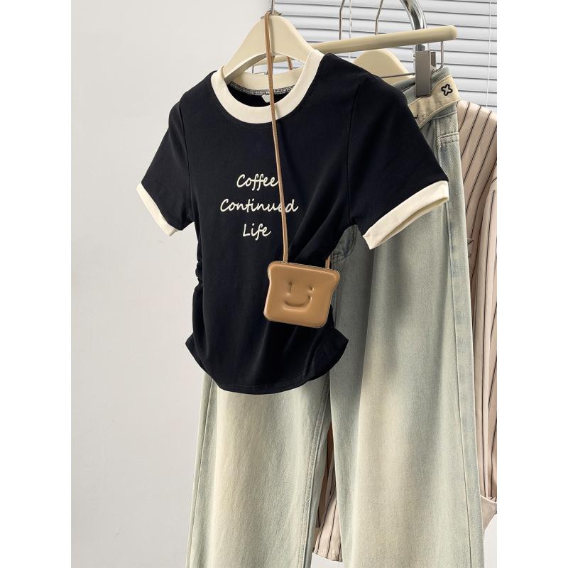 春 コーデ レディース ファッション オシャレ カワイイ シンプル きれいめ ナチュラル 上品カジュアル 婦人服 コントラスト レター プリント 半袖 Tシャツ 夏 スリム ウエスト プリーツ トップス