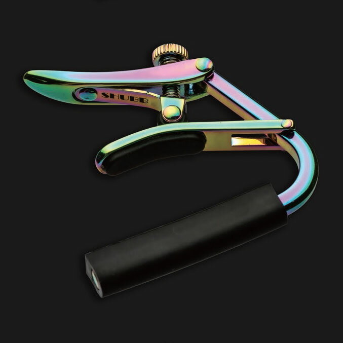 カポタストに求められる正確性・操作性を合わ持つデザインは精密に加工され特許技術を取り入いれた本体に、特別に配合されたゴム製のラバースリーブを合わせ、まるでプレイヤーの指先と同様の力を弦へと伝えます。何百万人のプレイヤーに愛し続けられる理由はここにあります。神秘的な光沢を放つ真珠のような輝きをもつ”Paua Pearl”シリーズ。SHUBBの持つ確かな技術と今までにない輝きをプラスでプレイヤーにお届けいたします。重量:53g