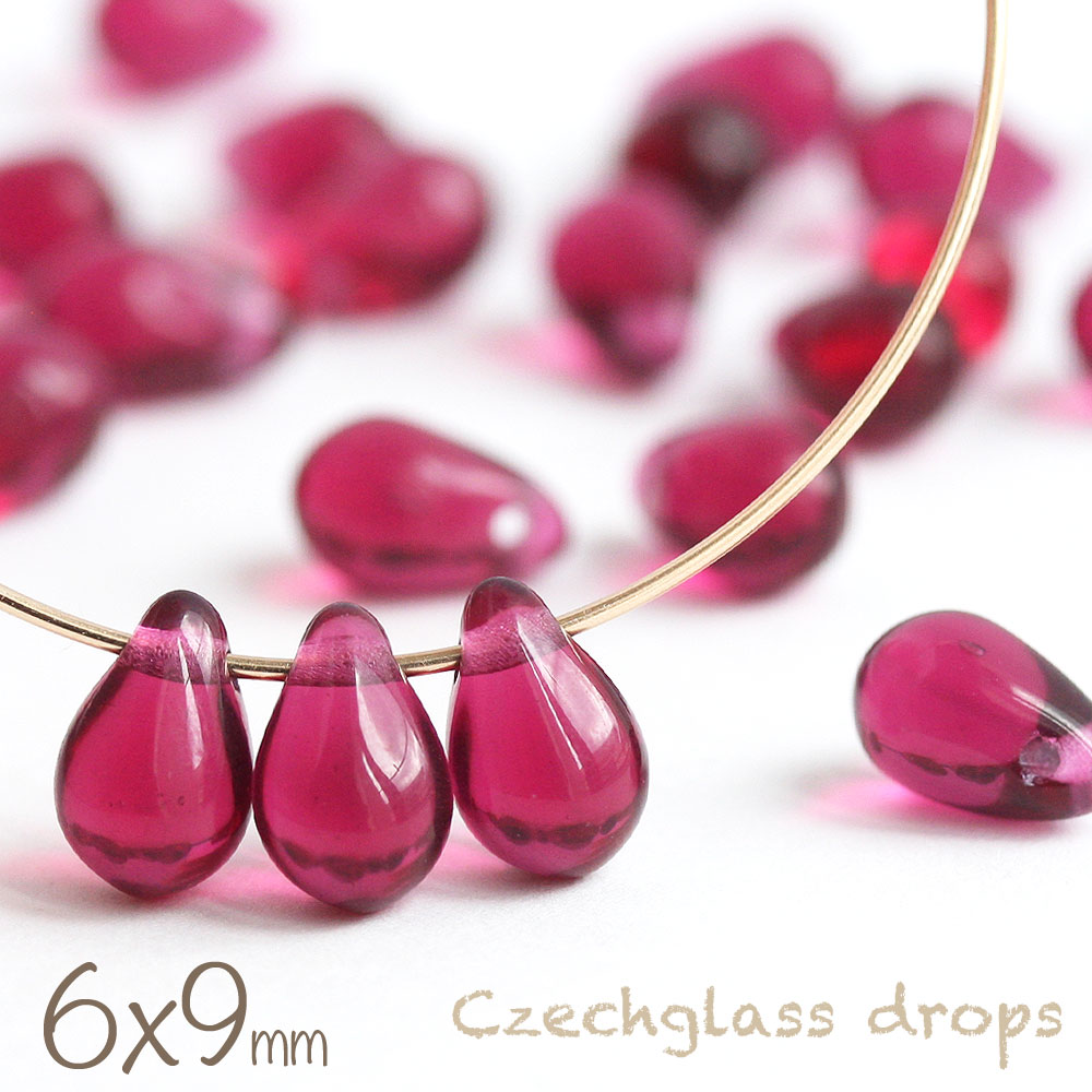 チェコガラスビーズ ドロップ 6×9mm フューシャピンク 20個 しずく チェコビーズ 手作りアクセサリー 材料 ビーズ パーツ 雫 シズク パープル 赤紫 ダークピンク 横穴 ピアス 素材