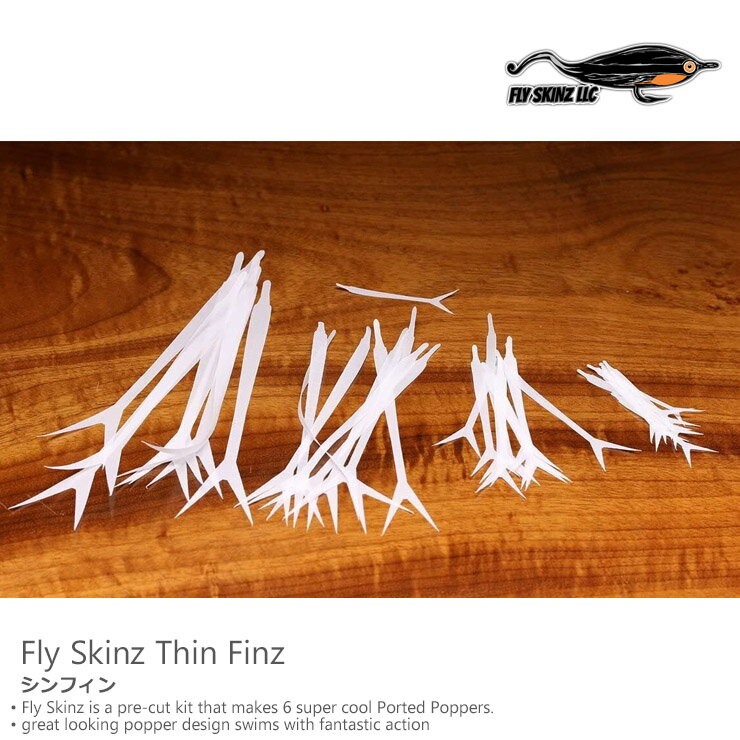 Fly Skinz / フライスキンズ Thin Finz シンフィン Fly Skinz Thin Finz 薄いナイロン素材でできたテイル材 ペラペラながら適度な張りがあり、シルエットと動きを両立させた秀逸なテイルマテリアル。 油性系の塗料を使用すると硬くなってしまい動きが悪くなります。 コピックなどのアルコール系の軽い塗料がおすすめです。 サイズ/入数 : スモール(2"/ 12枚)、ミデアム(3"/ 12枚)、ラージ(4.75"/ 9枚)