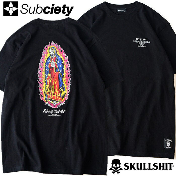 SKULLSHIT × Subciety / スカルシット × サブサエティ「FIRE MARIA TEE」限定コラボ 半袖Tシャツ オーバーサイズ ビッグT BIG マリア様 黒 ブラック ドクロ メンズレディース ストリート スケーター PUNK ROCK パンク ロック バンド フェス 骸骨祭り ステージ衣装 Rogia
